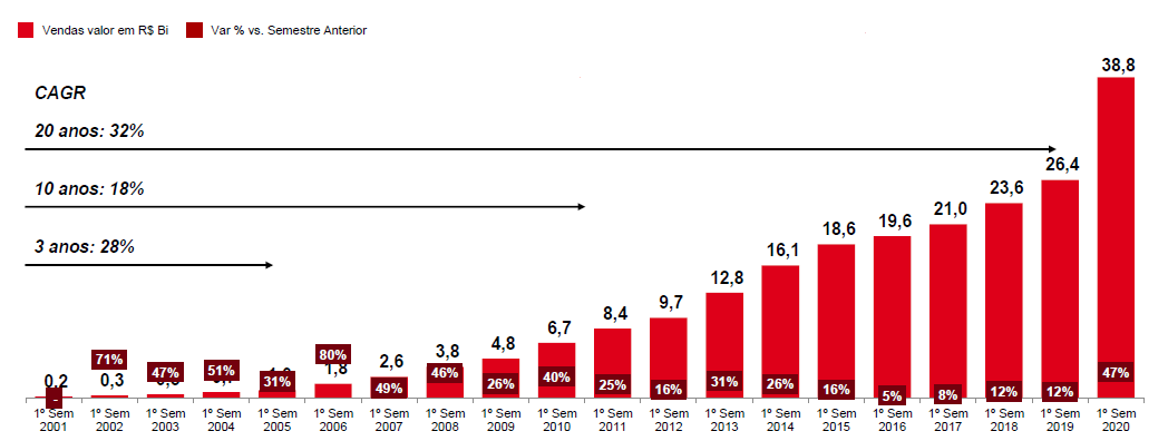 O faturamento dos seis primeiros meses de 2020 foi 9% maior do que o período correspondente no ano anterior, atingindo um recorde nos 20 anos de existência do e-commerce. Veja a seguir a curva de crescimento do faturamento.