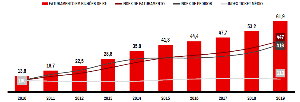 Note no gráfico disponibilizado pela Ebit|Nielsen o crescimento no faturamento do e-commerce na última década. Ao comparar o ano de 2010 com 2019, destaca-se a receita 4,5 vezes maior.